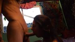 O cara está ali, tendo seu pênis chupado por sua linda namorada. Ela lhe faz um boquete até que ele derrame suas bolas no rosto dela.