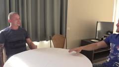 Morena com uma grande tatuagem tem dois caras na cama. Ela chupa seus paus e os fode em diferentes posições com os dois ao mesmo tempo até gozar.