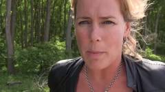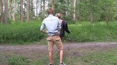 A puma loira tem um encontro com um jovem ao ar livre. Ela se ajoelha para chupar e depois é fodida nas árvores.