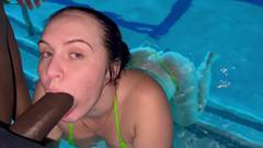 Um negro com um pau enorme se entrega a chupar e acariciar uma puta branca que está nadando em uma piscina. Depois de tanta felação e uma dose de esperma.