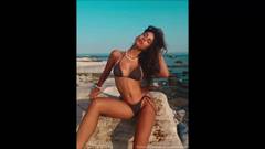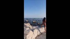 Na praia, ela está sentindo tesão, então decide tirar a roupa e masturbar sua buceta apertada e molhada sozinha.