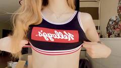 Uma jovem loira fica ao lado da câmera, mostra seus grandes seios naturais e, muito excitada, puxa as meias para baixo para masturbar sua buceta.