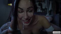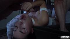 Depois de fodê-la profundamente na boca, ele a mancha com esperma