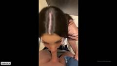 Uma morena se ajoelha na frente de um cara e chupa seu pau. Ela tem uma garganta muito profunda e sabe que vai ajudar seu amante a esvaziar suas bolas