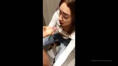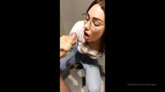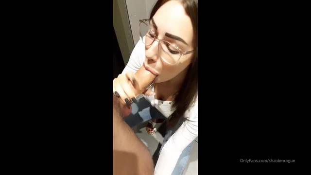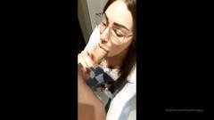 Uma jovem de uniforme, nem sequer tira os óculos quando chupa o pau de um cara! Ela se ajoelha na frente dele e chupa seu pau com profissionalismo.