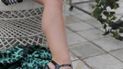 Uma cena doce em que uma loira com seios grandes os acaricia, toca e excita com erotismo sensual, sentada em uma cadeira de jardim.
