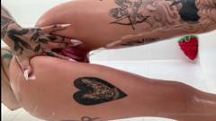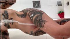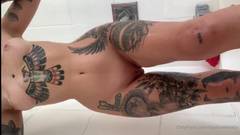 O corpo dessa garota é incrível! Veja as tatuagens, a buceta depilada e as nádegas redondas dela. Um show muito excitante.