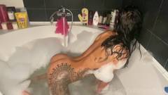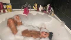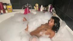 Uma garota muito bonita toma banho em uma banheira cheia de espuma, acaricia seu corpo sexy e mostra todos os seus inegáveis encantos.