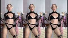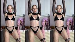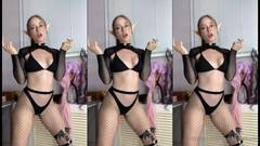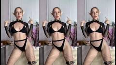 Uma linda garota amadora se veste de gatinha. Ela tem orelhas, rabo, meias arrastão e lingerie preta sexy e se move de maneira muito sensual!