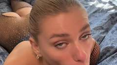 Loira amadora, filmada em close-up enquanto chupa o pênis grosso de seu amante, bem no fundo de sua garganta até que ele espirre em seu rosto.