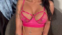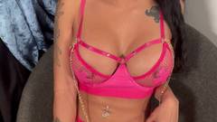 Essa morena tem peitos grandes e buceta depilada. Ela adora a cor rosa porque não tira o biquíni rosa quando transa com um vibrador rosa!