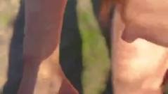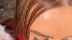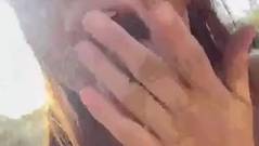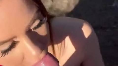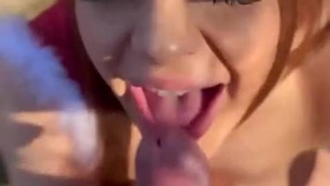 Uma jovem sexy chupa o pau de um homem ao ar livre em POV. Ela se ajoelha na frente dele e chupa até que jorros de esperma na cara!