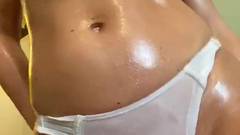 Adoro provocá-lo com meu corpo perfeito e minha lingerie branca sexy. Eu me cubro com óleo e acaricio meus seios grandes.