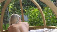 Essa loira amadora fica nua e se senta em uma cadeira de Bali para masturbar sua buceta, antes de ser esmagada por seu amante.