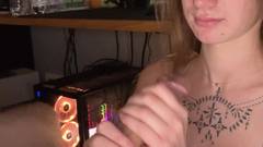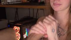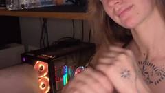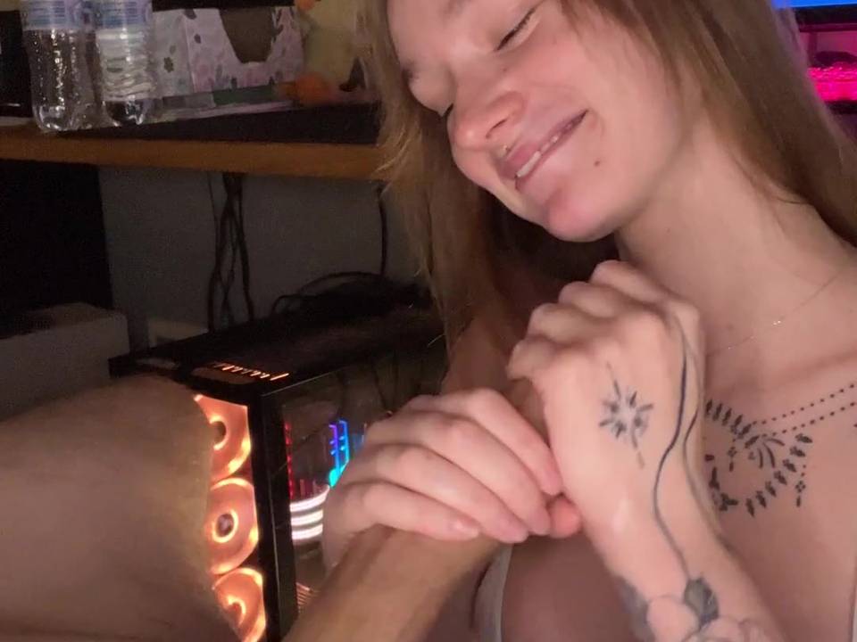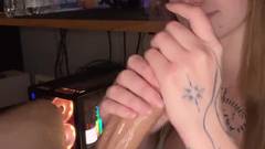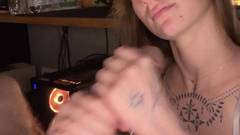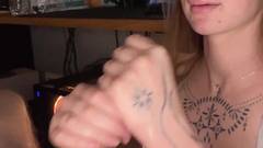 Essa linda amadora com tatuagens vai bater uma punheta no pau grande de seu amante e chupá-lo, cada centímetro dele, com prazer!