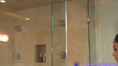 Esta cadela bonita tem mãos muito macias e sabe como usá-las para fazer uma boa massagem pra esse cara de sorte, enquanto ele está no banheiro.