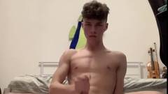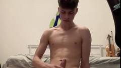 Um jovem rapaz de meias brancas tem um pênis realmente grande. Ele se senta em frente à câmera e se masturba até explodir uma grande quantidade de esperma
