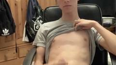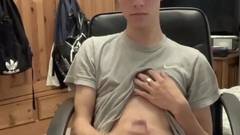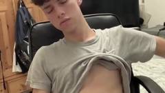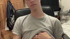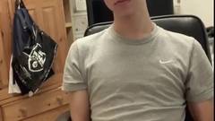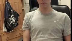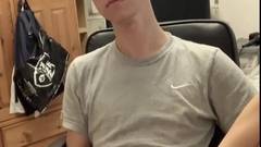 Um jvem geralmente tem um pênis duro e está excitado, então ele abaixa seu short cinza e masturba seu pênis até que ele exploda e esvazie suas bolas