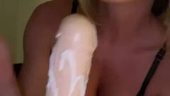 Loira linda em lingerie preta transparente nos mostra como ela chupa um vibrador com suas habilidades de sucção de pênis.