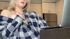 Garota loira com uma flanela, senta-se perto da câmera e masturba sua buceta com um brinquedo sexual rosa, mantendo a calcinha.