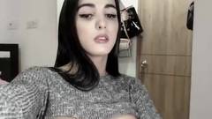 Morena trans excepcionalmente atraente, com peitos grandes e um rosto muito bonito, tira o pau para fora da calcinha e o masturba na frente da câmera