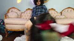 Puta de cabelos coloridos, tem um cara malandro que esquenta sua bunda com um brinquedo e depois a fode, no estilo cachorrinho e cowgirl invertido.