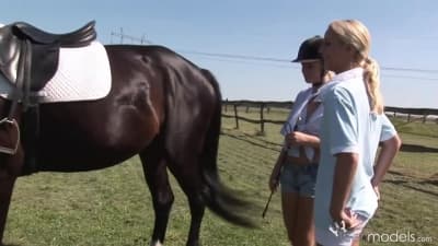 Esta bela loira tem uma amiga que é instrutora de equitação. Quando eles se vêem, não conseguem resistir e começam a lamber um ao outro.
