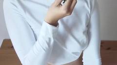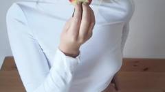 Jovem loira praticando suas habilidades de felação com o strawberrycchia! O chantilly representa o sêmen e o gosto em sua boca a excita