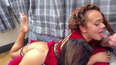 A ruiva com uma lingerie sexy está do lado de fora se tocando. Ela fica com muito tesão e convida um homem aleatório para transar com ela.