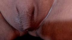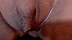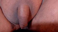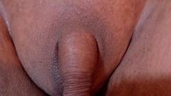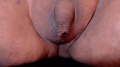 Parece que o pênis minúsculo dele se perde entre as bolas, mas é isso que essa transexual morena mais gosta que aconteça com ela e hoje ela se masturba