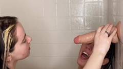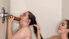 Chegou a hora do conteúdo molhado, com duas modelos on-line tirando os peitos para fora e chupando vibradores colados no chuveiro.