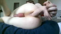 A trans de óculos deita-se perto da câmera e você pode vê-la fodendo profundamente com um grande vibrador em sua bunda e ao mesmo tempo batendo em seu pau!