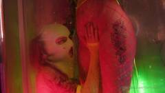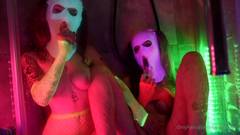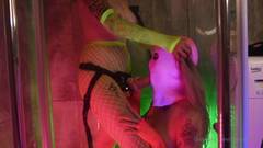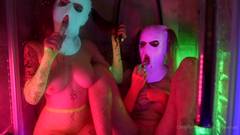Essas duas garotas tatuadas e mascaradas se divertem fazendo amor no chuveiro usando um strapon e brinquedos sexuais!