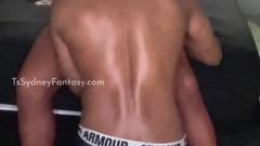 Uma mulher trans amadora de bunda grande, usando lingerie vermelha, tem seu pênis preto chupado por um homem com máscara. Depois, ela o fode bem gostoso.