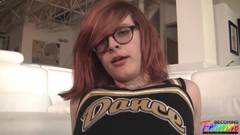 Uma prostituta trans ruiva de óculos e meias até os joelhos faz um bom boquete no pau de seu amante porque ela quer uma penetração forte e profunda