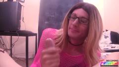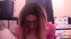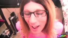 A transexual Jessica Lynne usa seus óculos para chupar um pau em POV e levar uma surra de pica na bunda.
