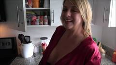 Brianna Beach, uma loira excitada com peitos grandes, chupa um pau grande, usa seus peitos para masturbá-lo e o cavalga até ele gozar.