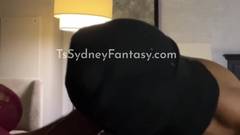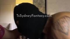 Um cara com uma máscara na cabeça chupa o grande pênis negro de uma incrível prostituta trans em lingerie sexy e, em seguida, empurra sua bunda para fora.