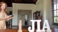 A bela e jovem ruiva Gia aconselha seus fãs na frente de uma webcam com um vibrador em uma mesa e o mostra a eles,
