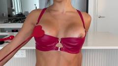 Essa morena sexy, vestida com uma linda lingerie vermelha, masturba sua buceta na cozinha, para seus fãs!