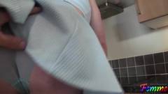 A transexual loira com um vestido azul curto coloca sua bunda na frente desse fodedor para provocá-lo. Ela acaba fazendo um boquete para ele em POV.