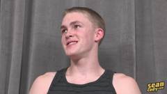 Rod, um homem de cabelos loiros, despe-se na frente da câmera, senta-se no sofá e masturba intensamente seu pênis.