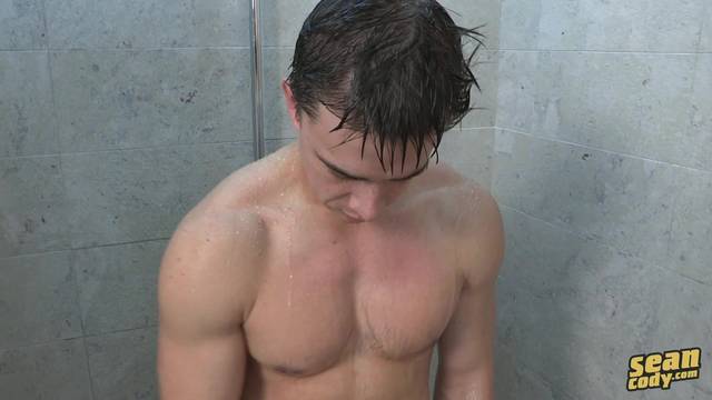O jovem gay musculoso Curt se masturba o pau e estica o cu com os dedos, enquanto está sentado no sofá. Também se masturba debaixo do chuveiro.