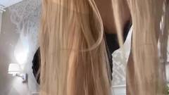 A jovem loira abre o buraco com os dedos, acaricia a buceta, despe-se e toca o vibrador grande e duro como uma vagabunda experiente.