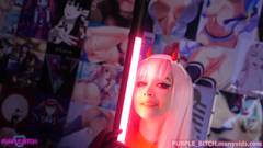 Em uma fantasia de demônio de látex vermelho, Purple Bitch é penetrada e fodida duas vezes por dois paus duros.