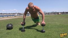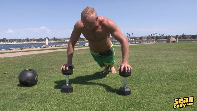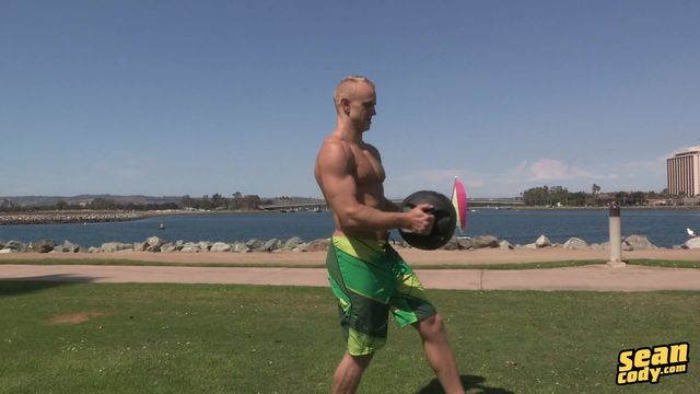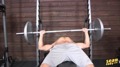 Chuck treina e exibe seus belos músculos antes de se punhetar o pau duro em solitário e de gozar por todo o seu corpo sexy e nu.