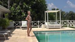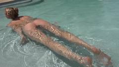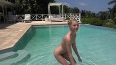 Uma jovem nua de cabelos loiros entra na piscina e nos mostra a bunda e a buceta depilada. Ela está perfeita!