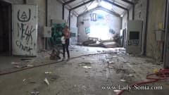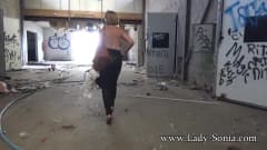 A loira madura Lady Sonia passeia por uma velha fábrica abandonada e, a certa altura, tira a blusa para nos mostrar seus peitos grandes!