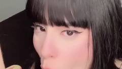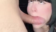 Linda morena em lingerie preta sexy se ajoelha na frente de seu amante com o pênis dele na boca e o engole como uma profissional