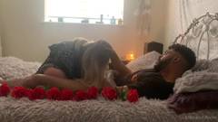 Um jovem de cabelos escuros coloca rosas vermelhas na cama para sua namorada loira. A garota o agradece sentando com a buceta no rosto dele e cavalgando